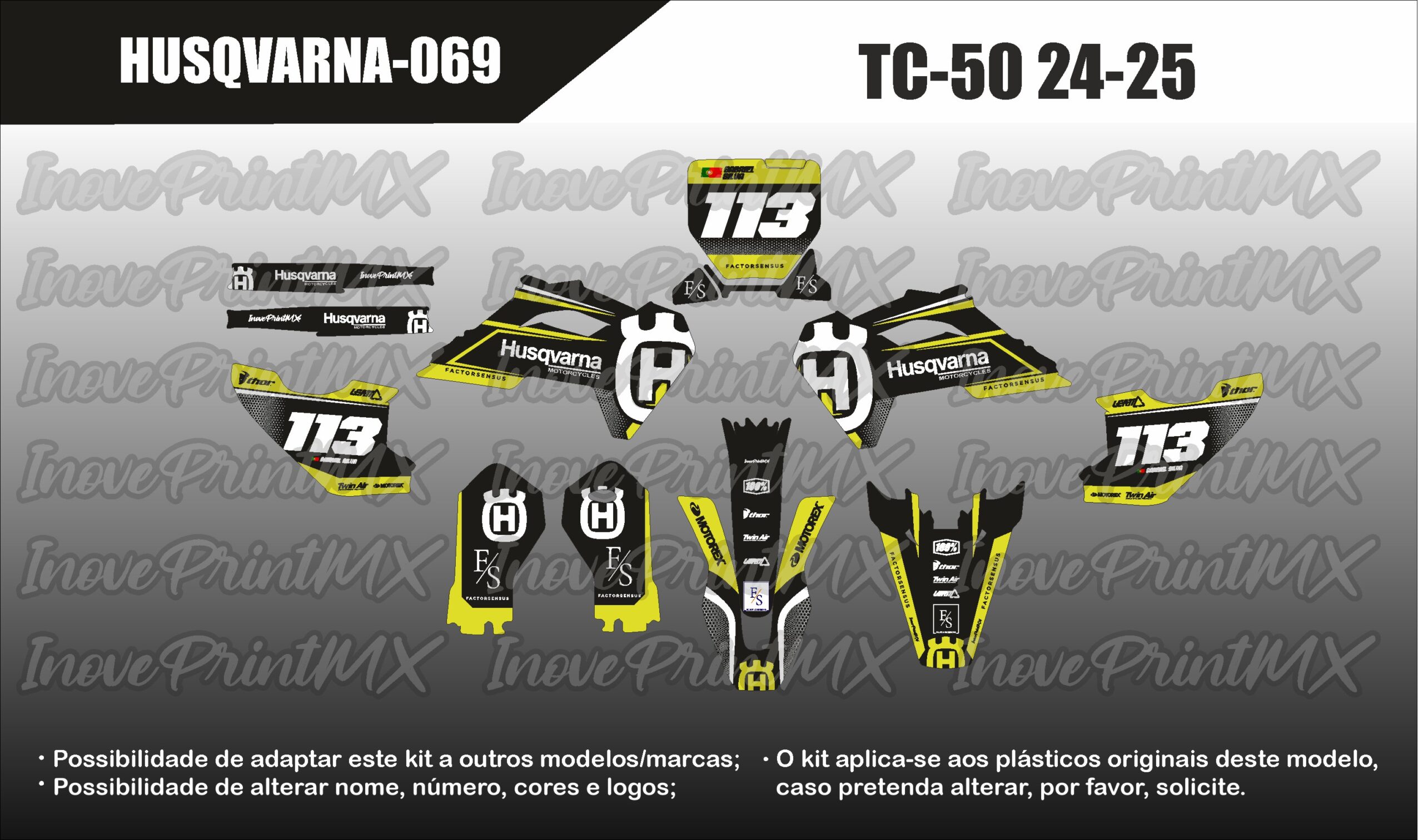 Solicite, por favor, as alterações pretendidas (nome, número, cores, etc). Possibilidade de adaptar este kit para holografico/cromado. Também dispomos de diversos acabamentos como Mate, Glitter; Fluorescente, laminação 3D, Lâminação Texturada, etc.