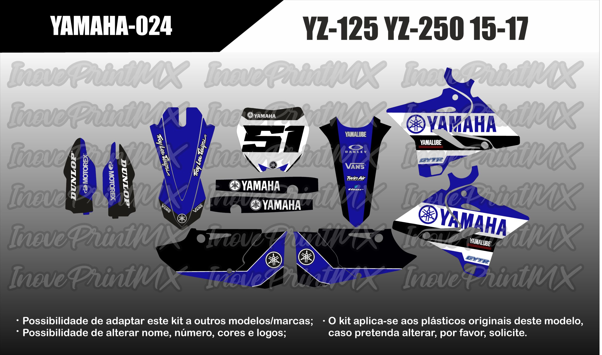 Solicite, por favor, as alterações pretendidas (nome, número, cores, etc). Possibilidade de adaptar este kit para holografico/cromado. Também dispomos de diversos acabamentos como Mate, Glitter; Fluorescente, laminação 3D, Lâminação Texturada, etc.