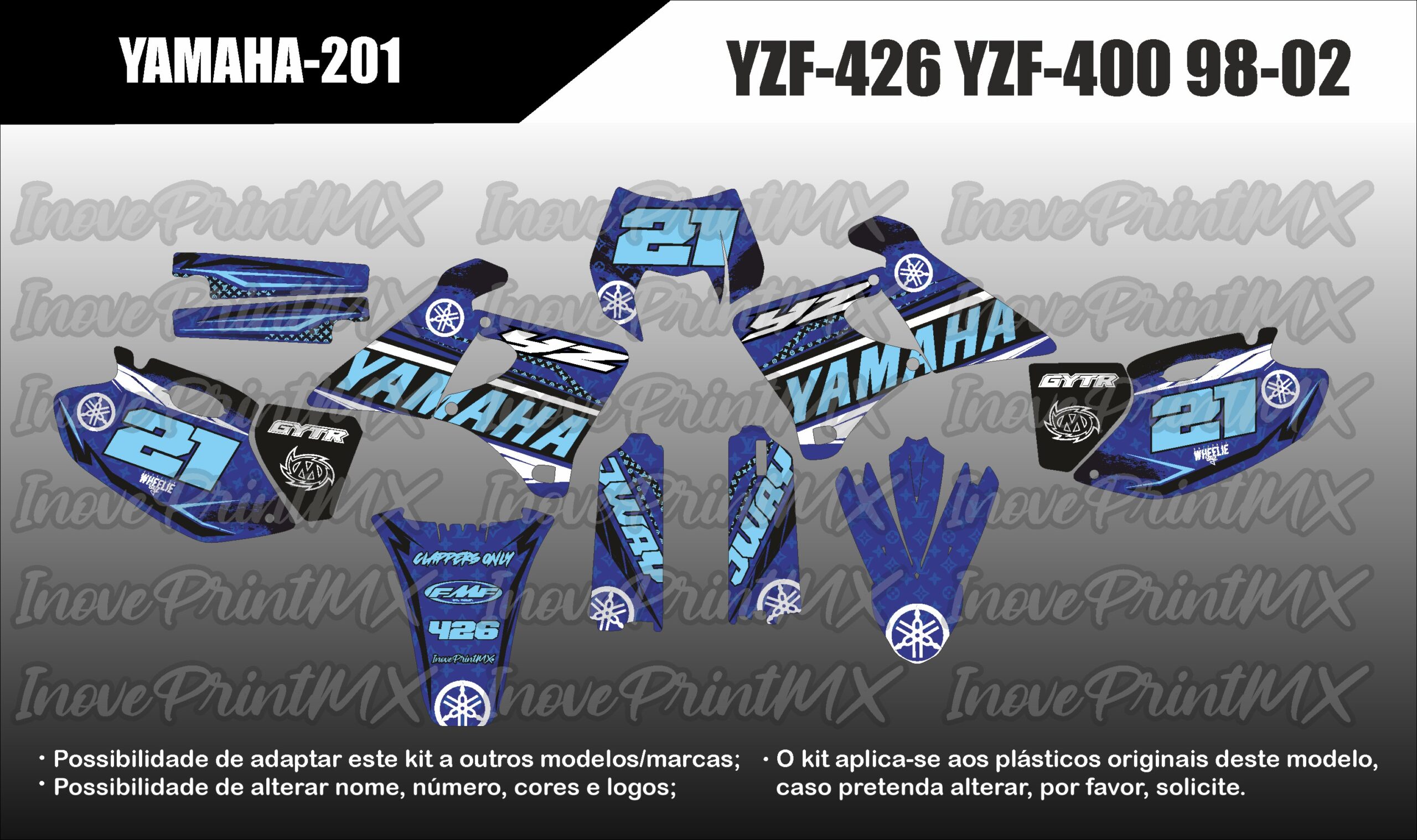 Solicite, por favor, as alterações pretendidas (nome, número, cores, etc). Possibilidade de adaptar este kit para holografico/cromado. Também dispomos de diversos acabamentos como Mate, Glitter; Fluorescente, laminação 3D, Lâminação Texturada, etc.
